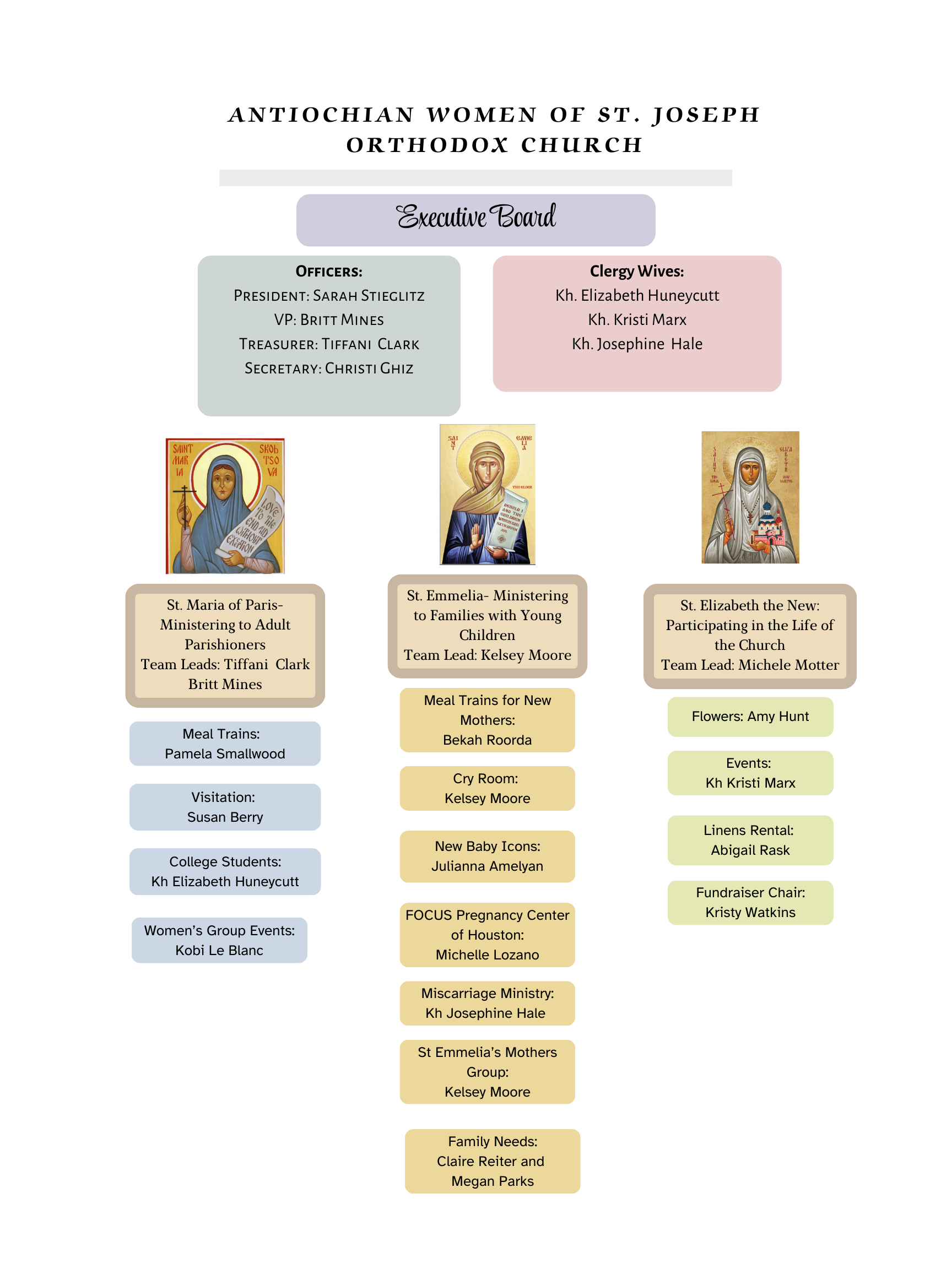 The Antiochian Women of St. Joseph is our local chapter of the Antiochian Orthodox Christian Women of North America (AOCWNA) founded in 1973.